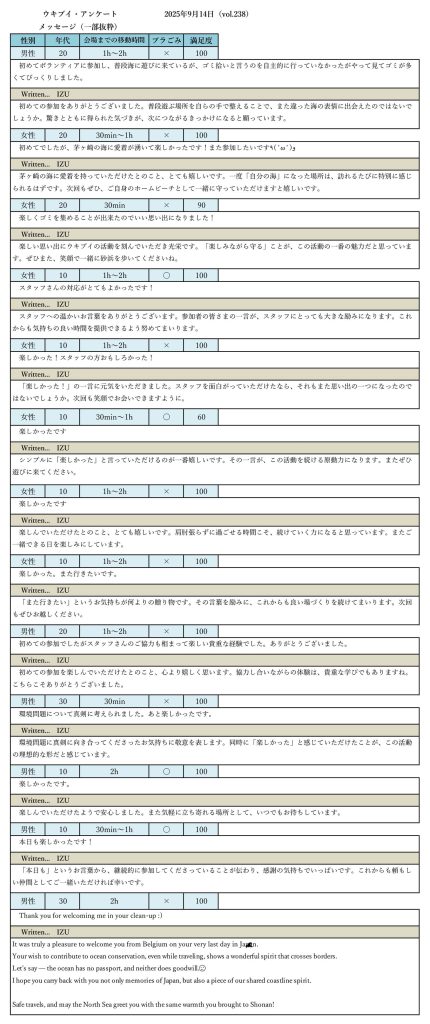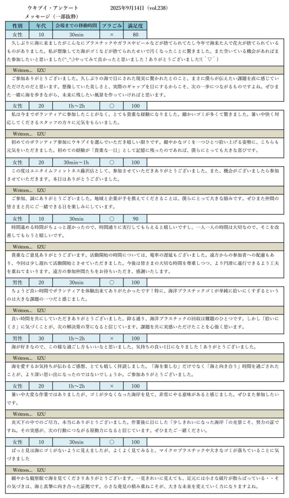「思った以上にゴミが多く驚いた」「細かいプラスチックの回収が大変だった」「楽しく参加できた」「初めての体験が貴重だった」